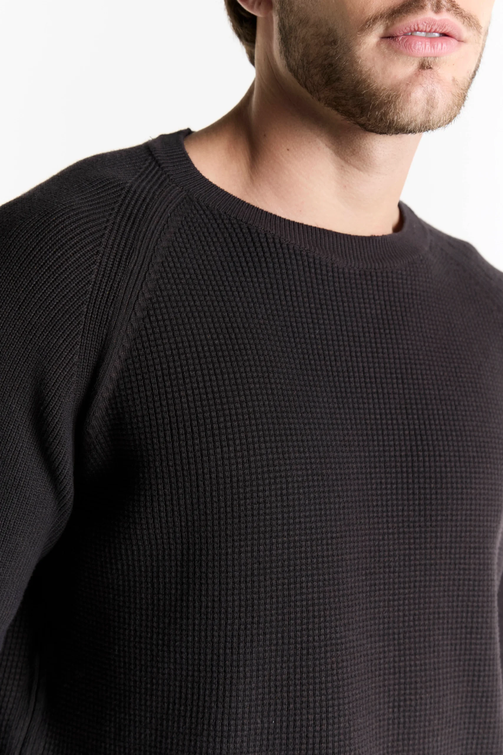 Tejido en una mezcla de fibras de alta calidad, este sweater raglán tramado combina textura y suavidad en equilibrio perfecto. Su diseño versátil y su calce cómodo envuelven el cuerpo con estilo y calidez.