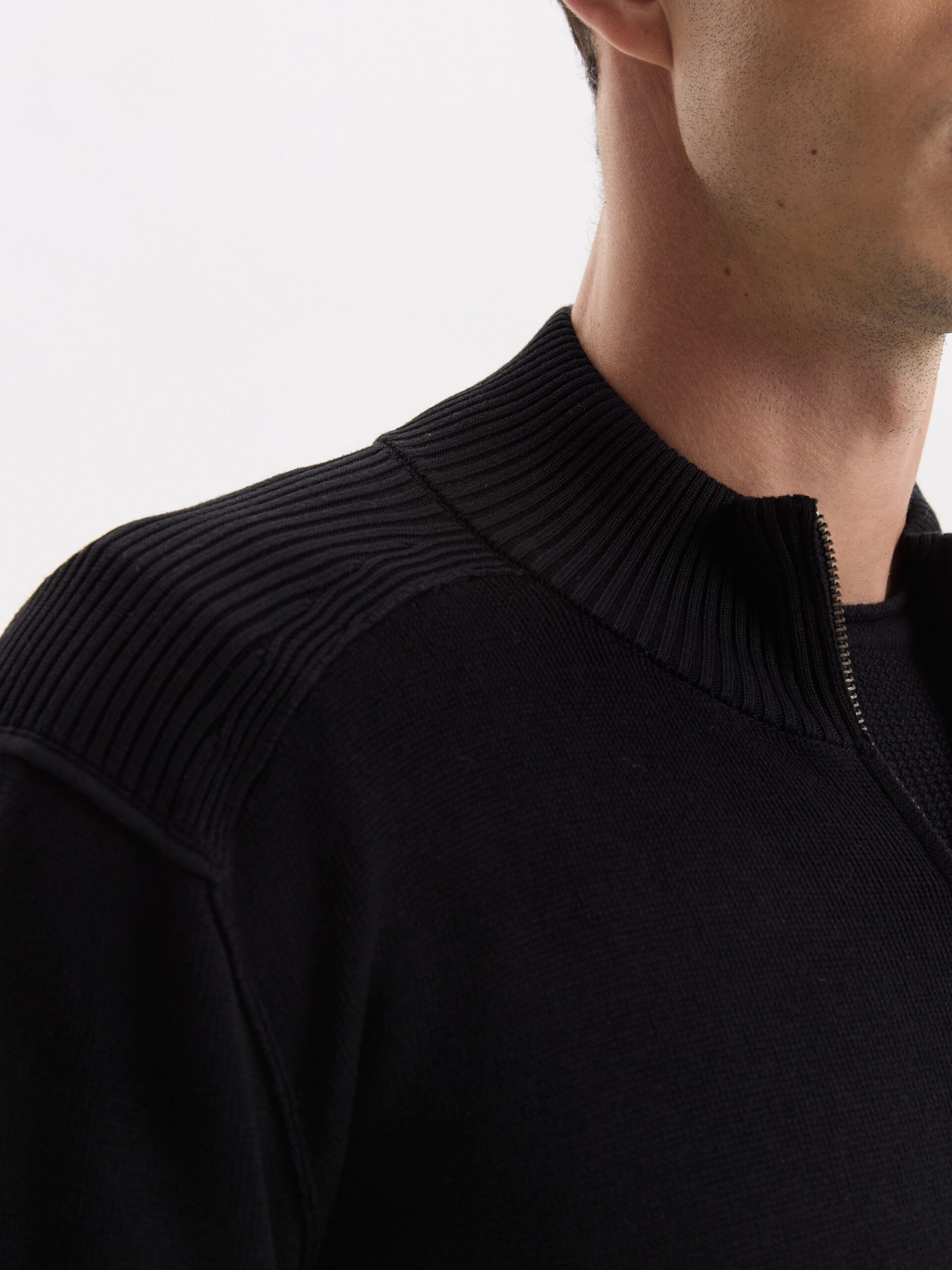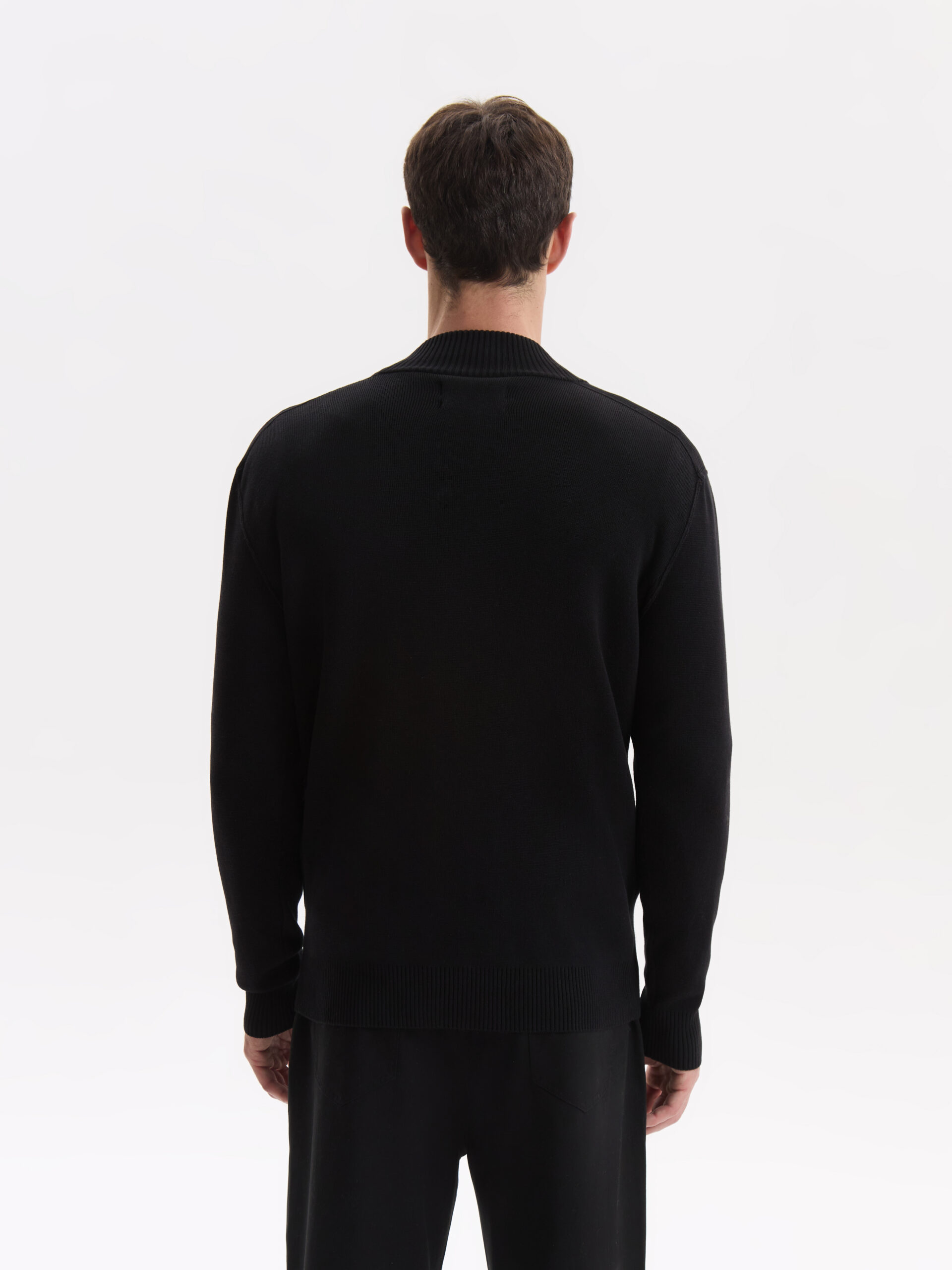 Campera tejida en mezcla de algodón y viscosa, que combina suavidad y caída natural. Presenta mangas en corte pipa que destacan por su silueta contemporánea.