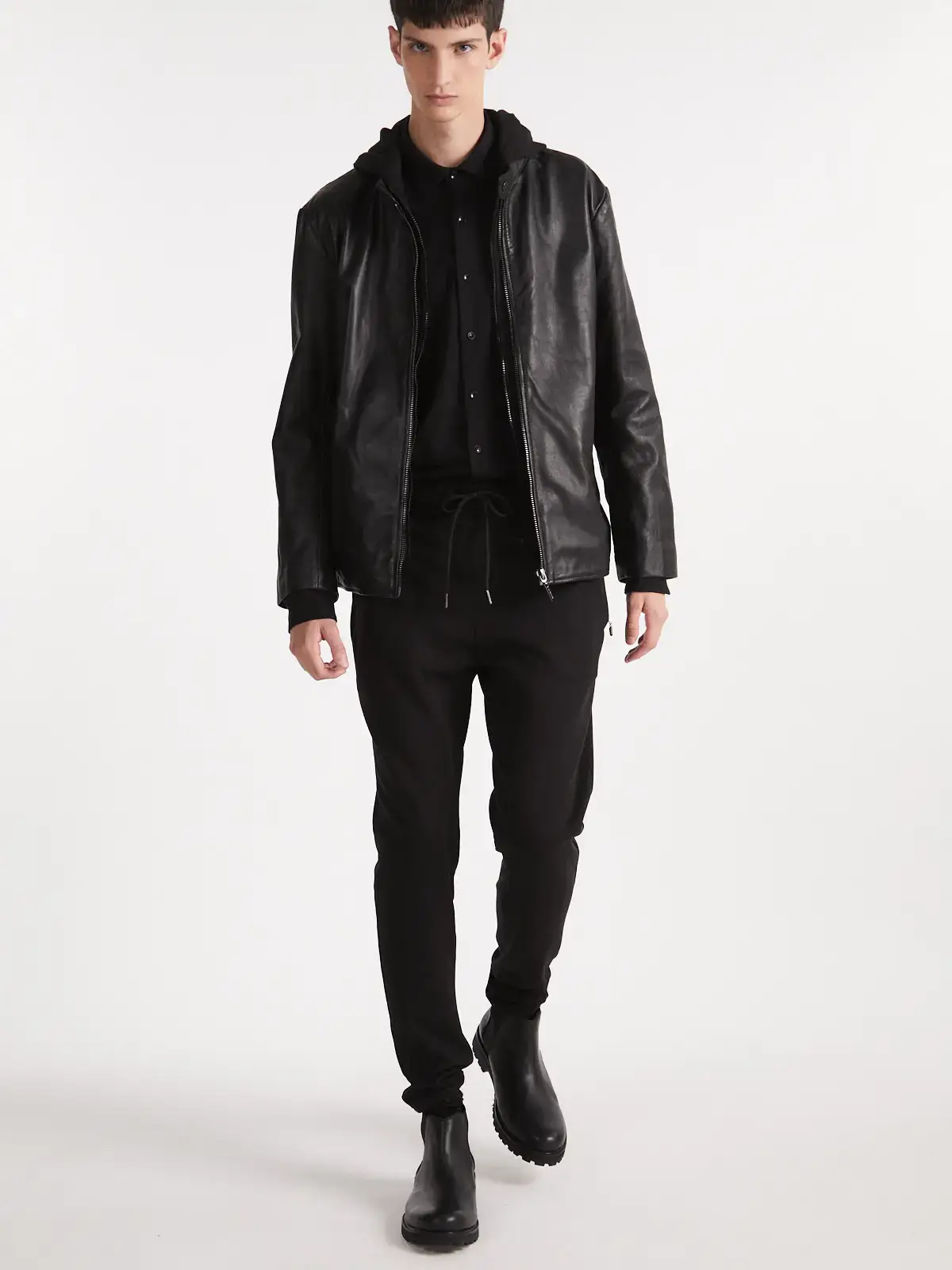 Campera 100% cuero whashed. Interior en jersey con frente y capucha desmontable