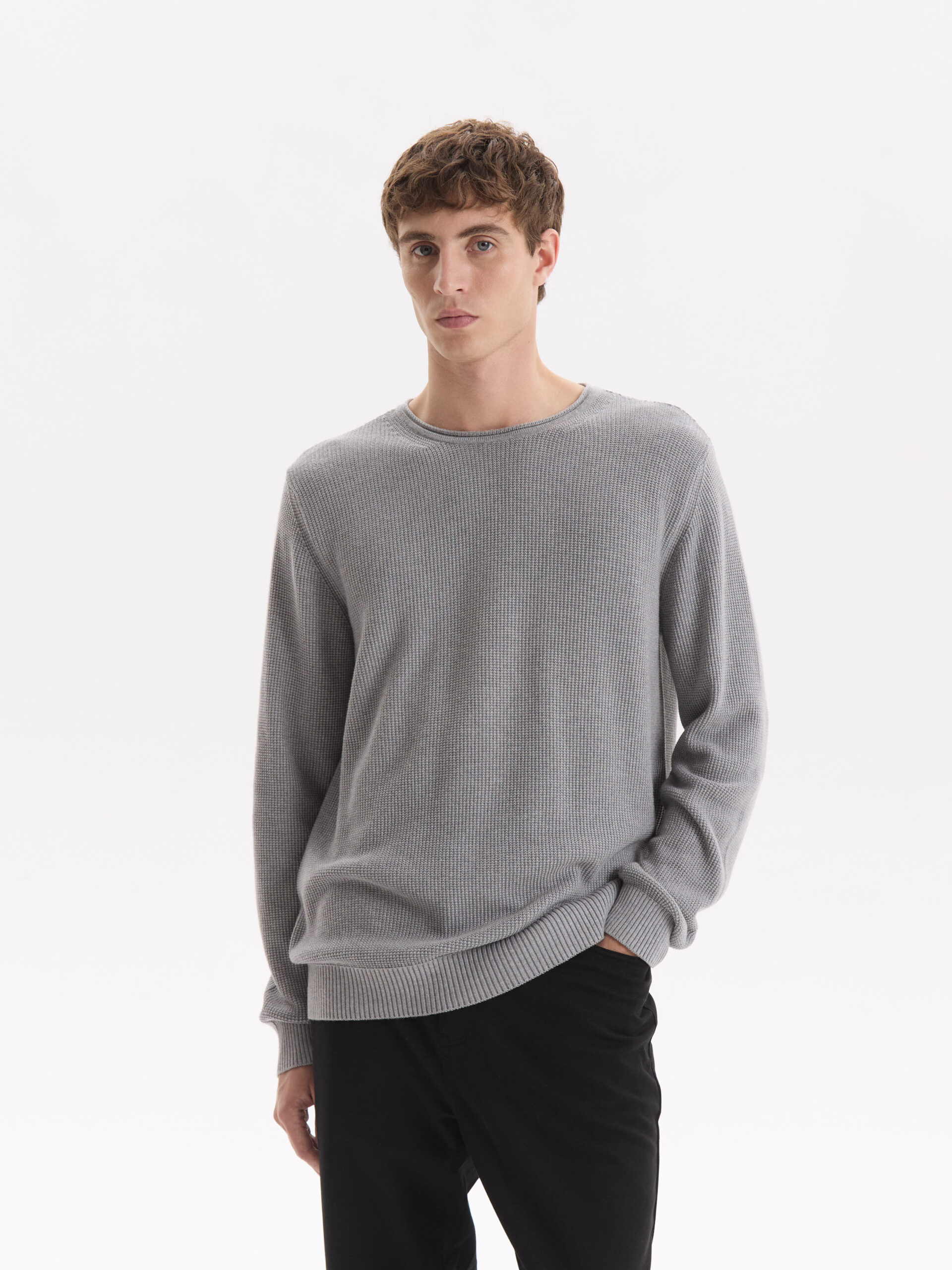 Sweater tejido en lana con fibras seleccionadas y cuello terminado en roulotte. Su trama tipo arroz realza la textura y aporta carácter al diseño.