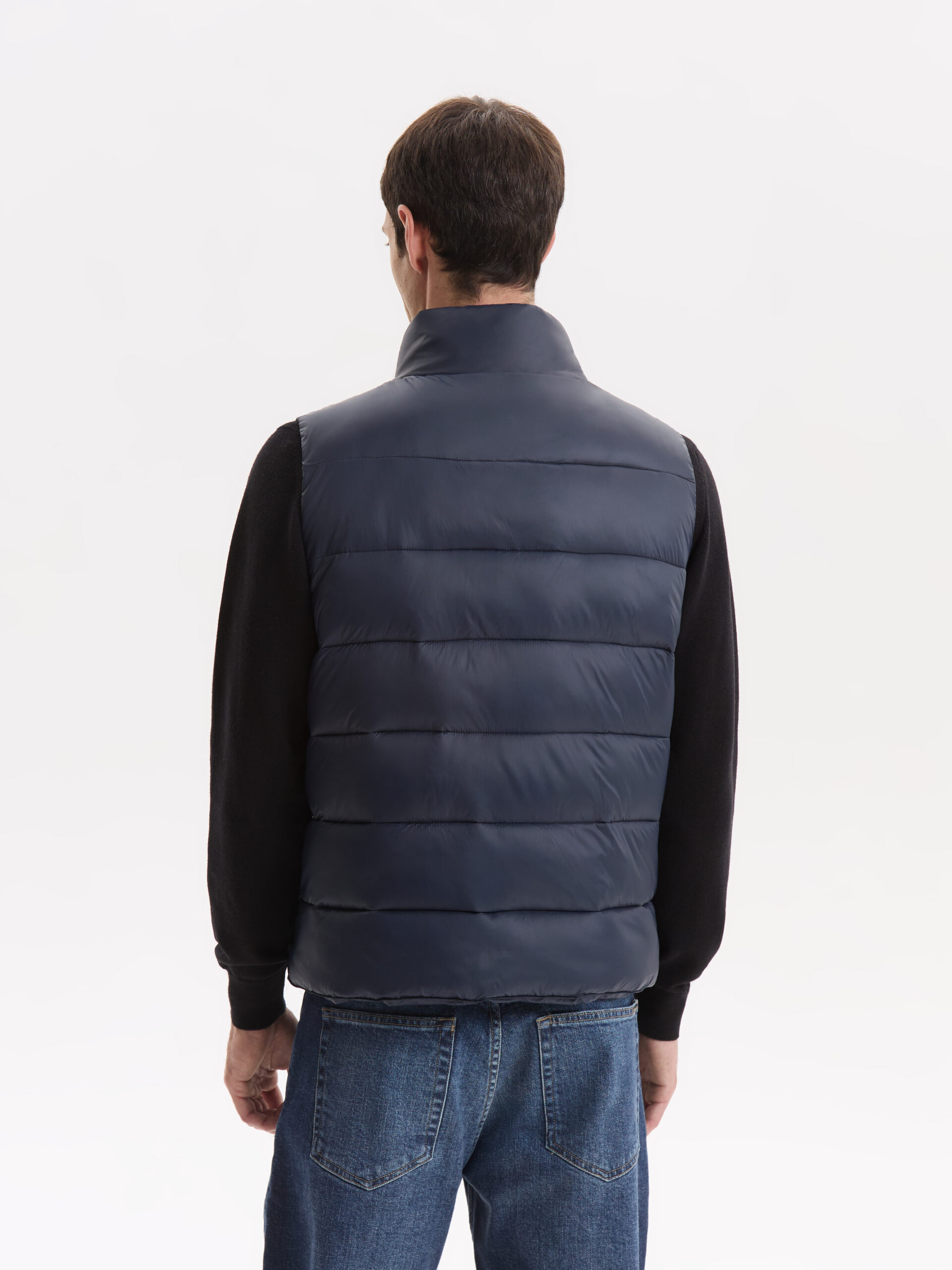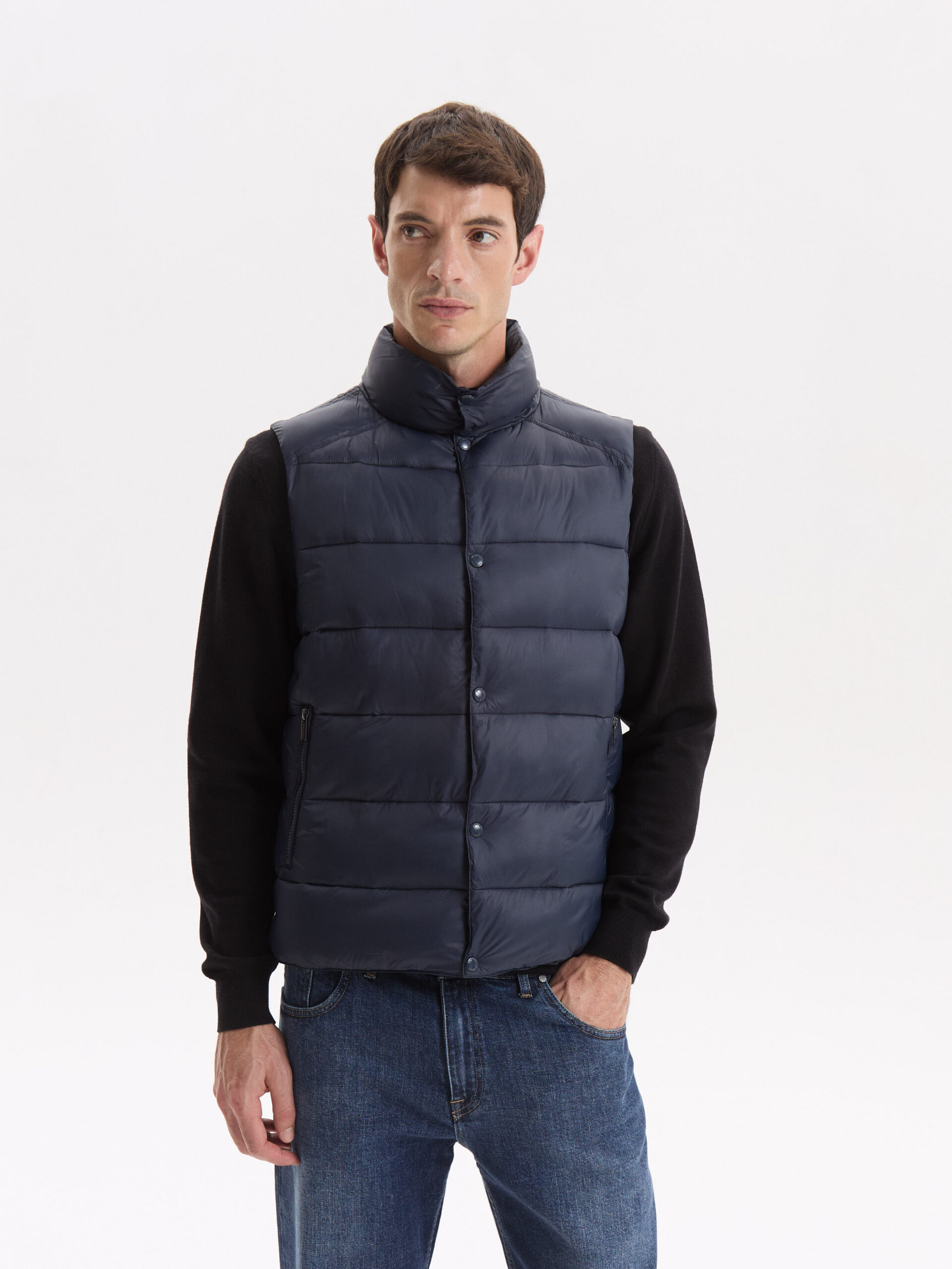 Este chaleco de cuello alto ofrece una estructura definida y abrigo liviano. Su diseño combina funcionalidad y confort en una prenda moderna y versátil.