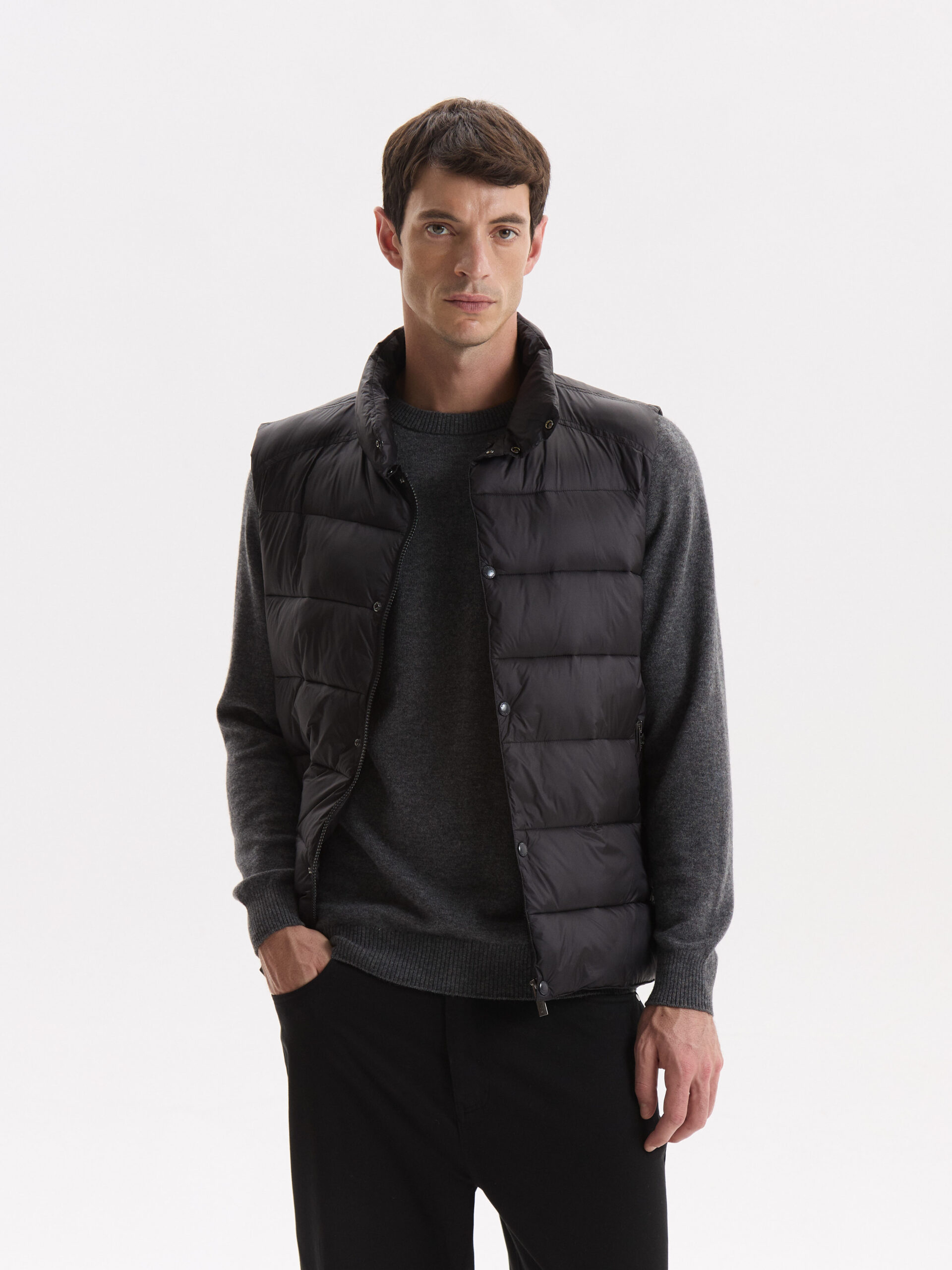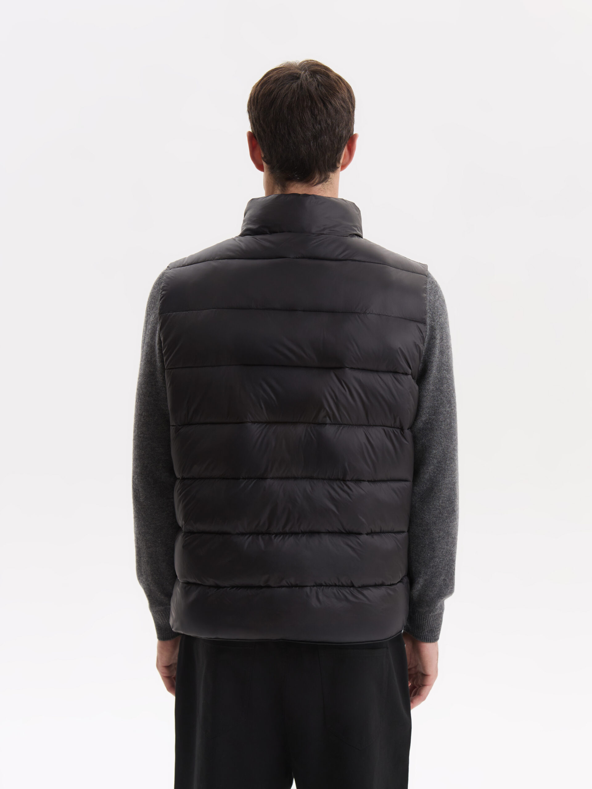 Este chaleco de cuello alto ofrece una estructura definida y abrigo liviano. Su diseño combina funcionalidad y confort en una prenda moderna y versátil.