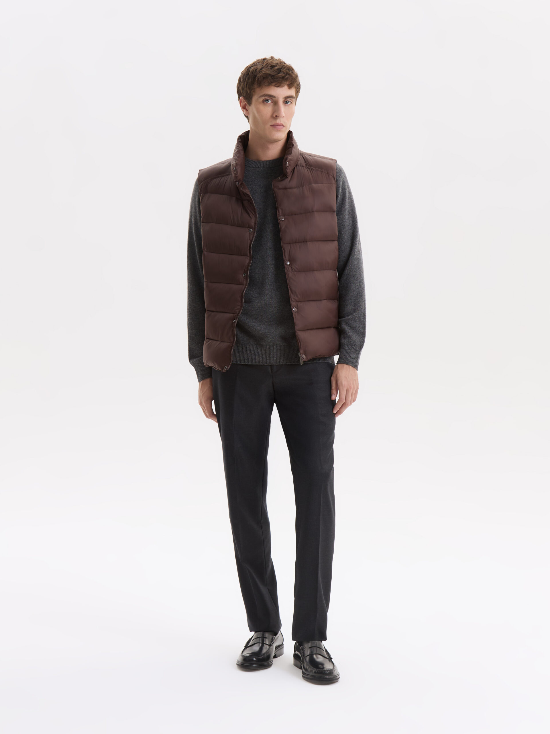 Este chaleco de cuello alto ofrece una estructura definida y abrigo liviano. Su diseño combina funcionalidad y confort en una prenda moderna y versátil.