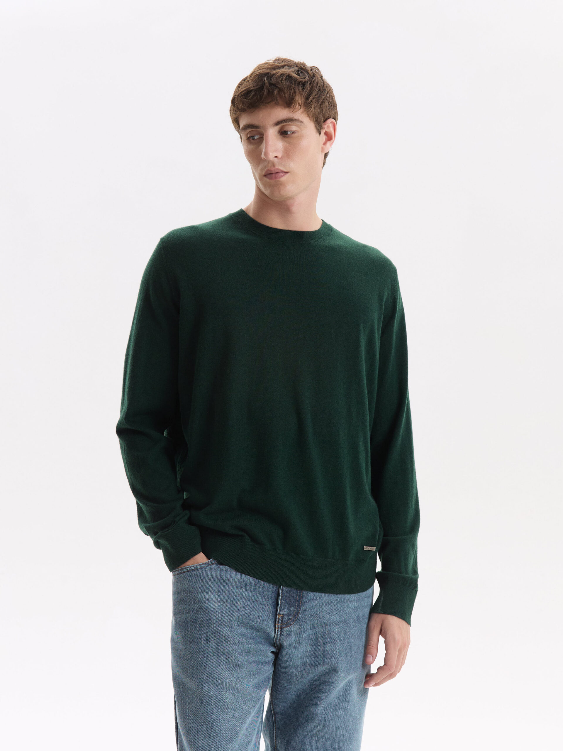 Sweater de cuello redondo tejido en una mezcla de lana merino y fibras seleccionadas. Una prenda que fusiona suavidad excepcional y calidez.