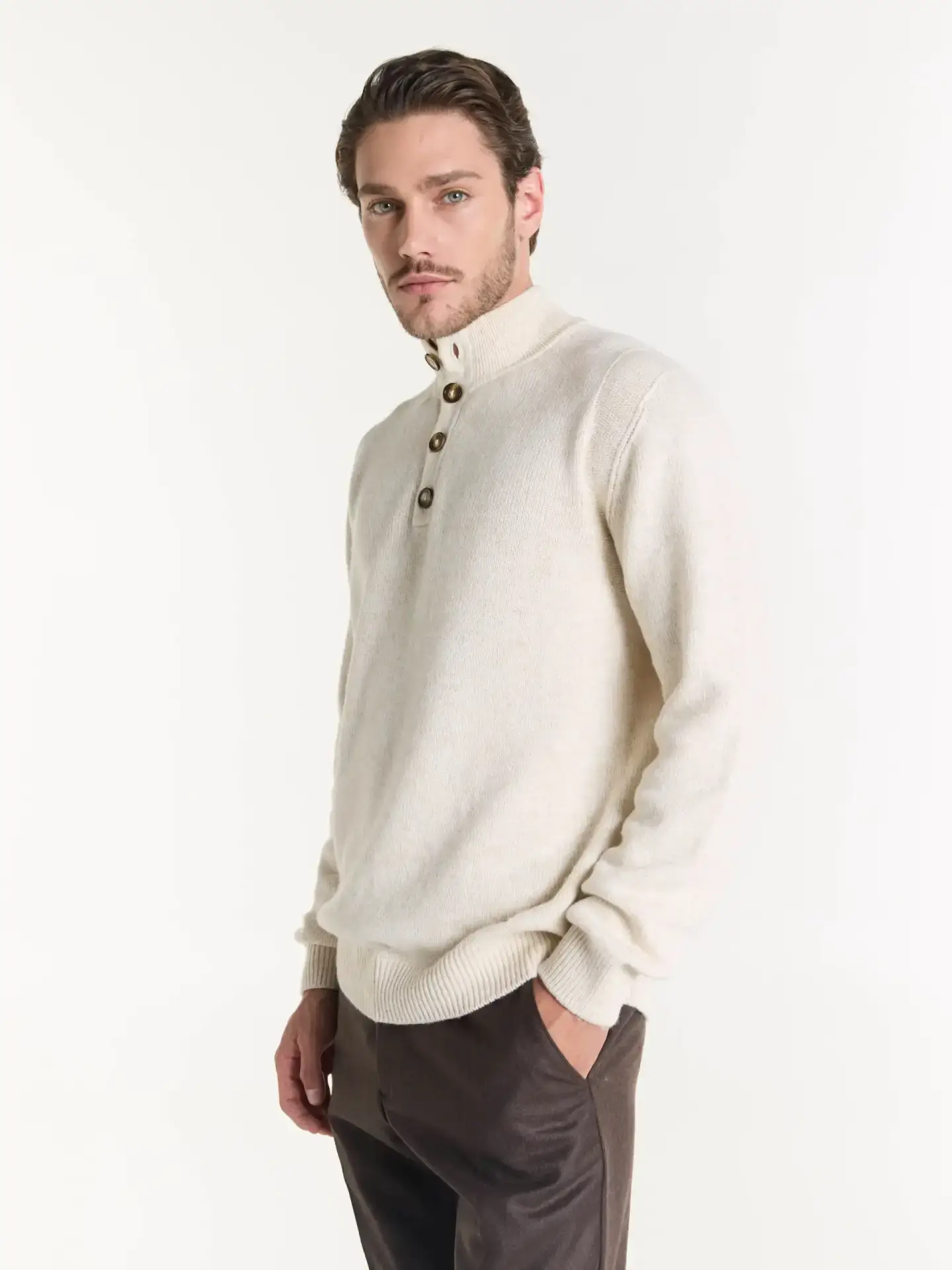 Sweater de media polera con detalle de botones que aporta elegancia y funcionalidad. De estilo clásico confeccionado en tejido suave y cálido.