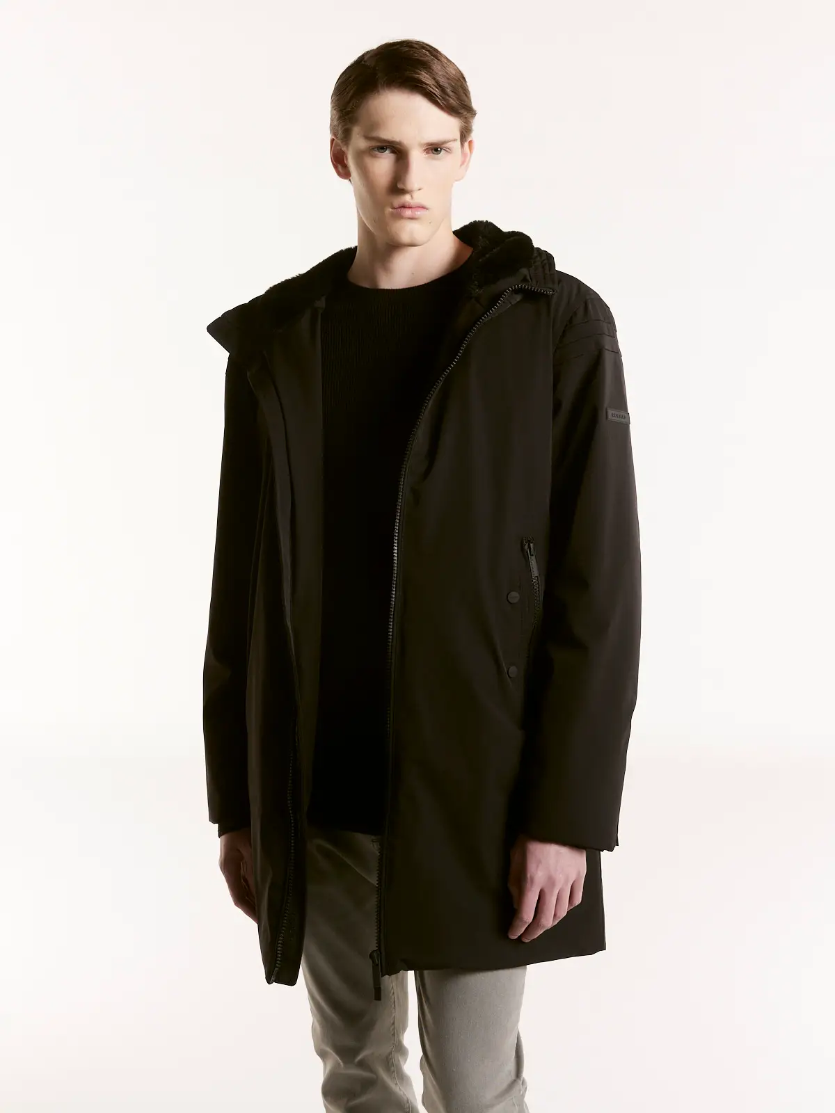 Confeccionada en una sarga 4 Ways Stretch, la prenda no solo asegura su rol de abrigo, sino que también su confortabilidad, ya que acompaña el cuerpo en cada uno de sus movimientos. Capucha forrada de piel sintética.
