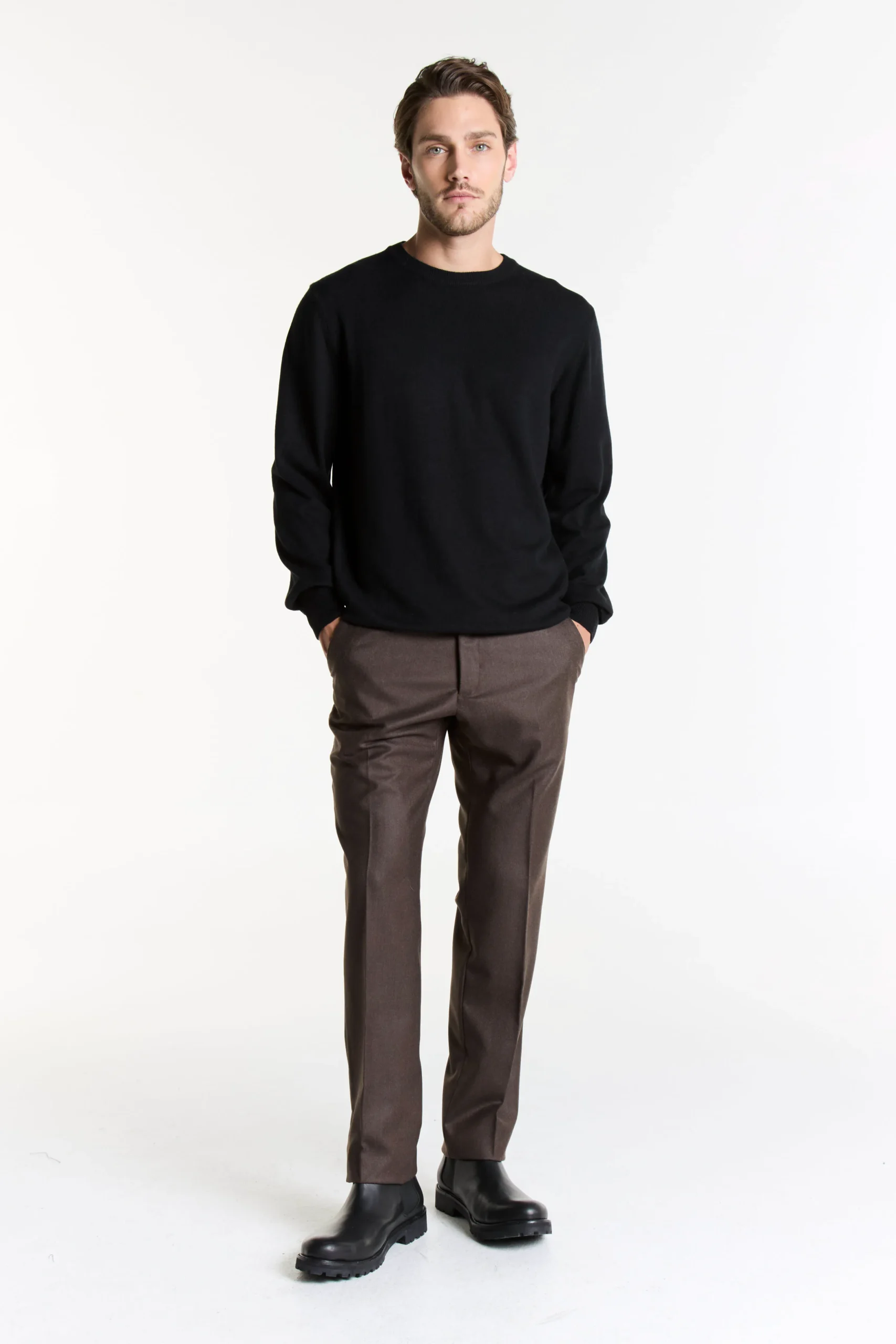 Tejido en una mezcla de fibras suaves, este sweater de cuello redondo envuelve el cuerpo con calidez y confort. Su diseño atemporal y acabado impecable elevan cualquier look con elegancia natural.