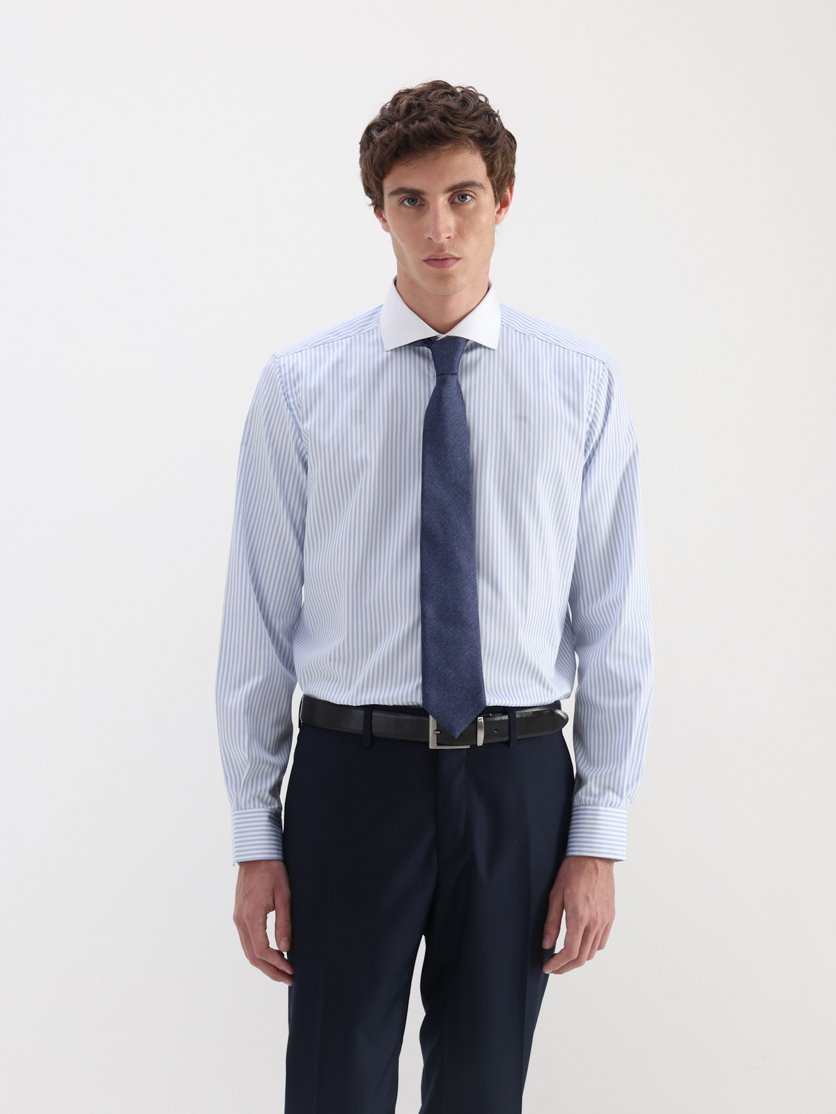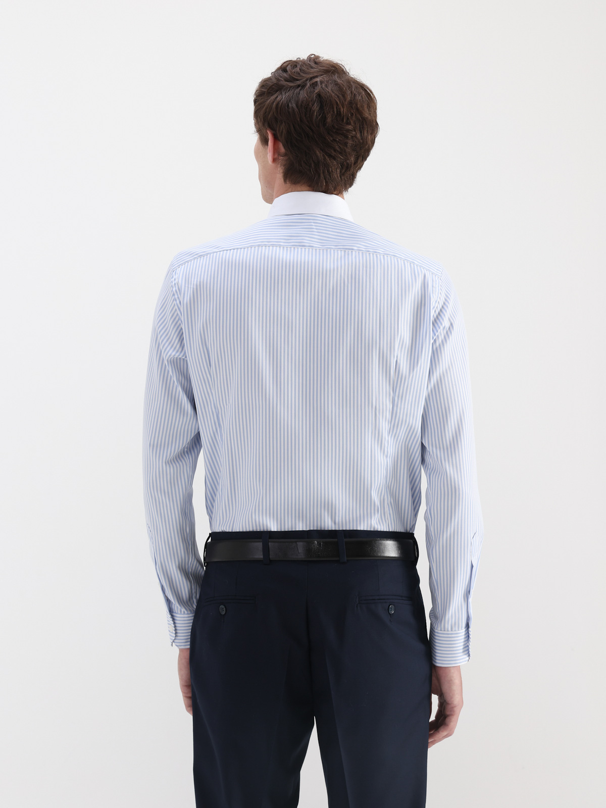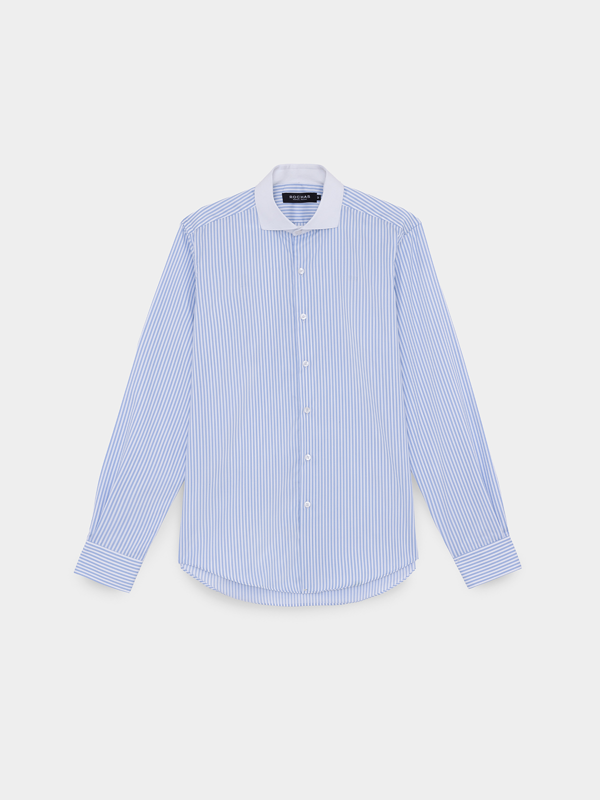 Camisa a rayas confeccionada en 100% algodón, con cuello blanco a contraste que realza su estilo clásico y refinado.