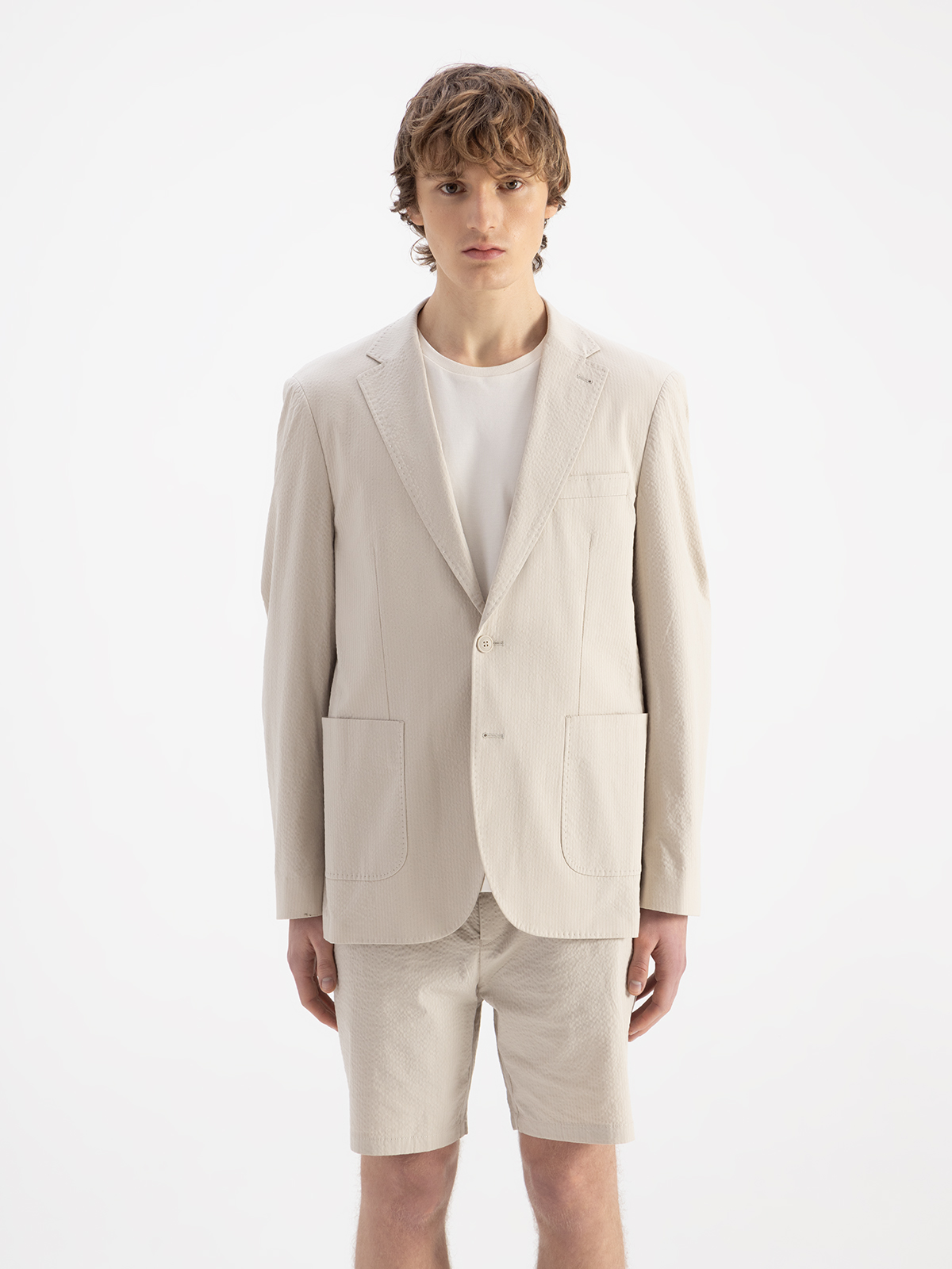 Ligero y con una textura única, este saco de seersucker es ideal para los días cálidos. Su tejido aireado y su diseño relajado aportan frescura sin perder elegancia. Perfecto para un look sofisticado con un toque casual y moderno.