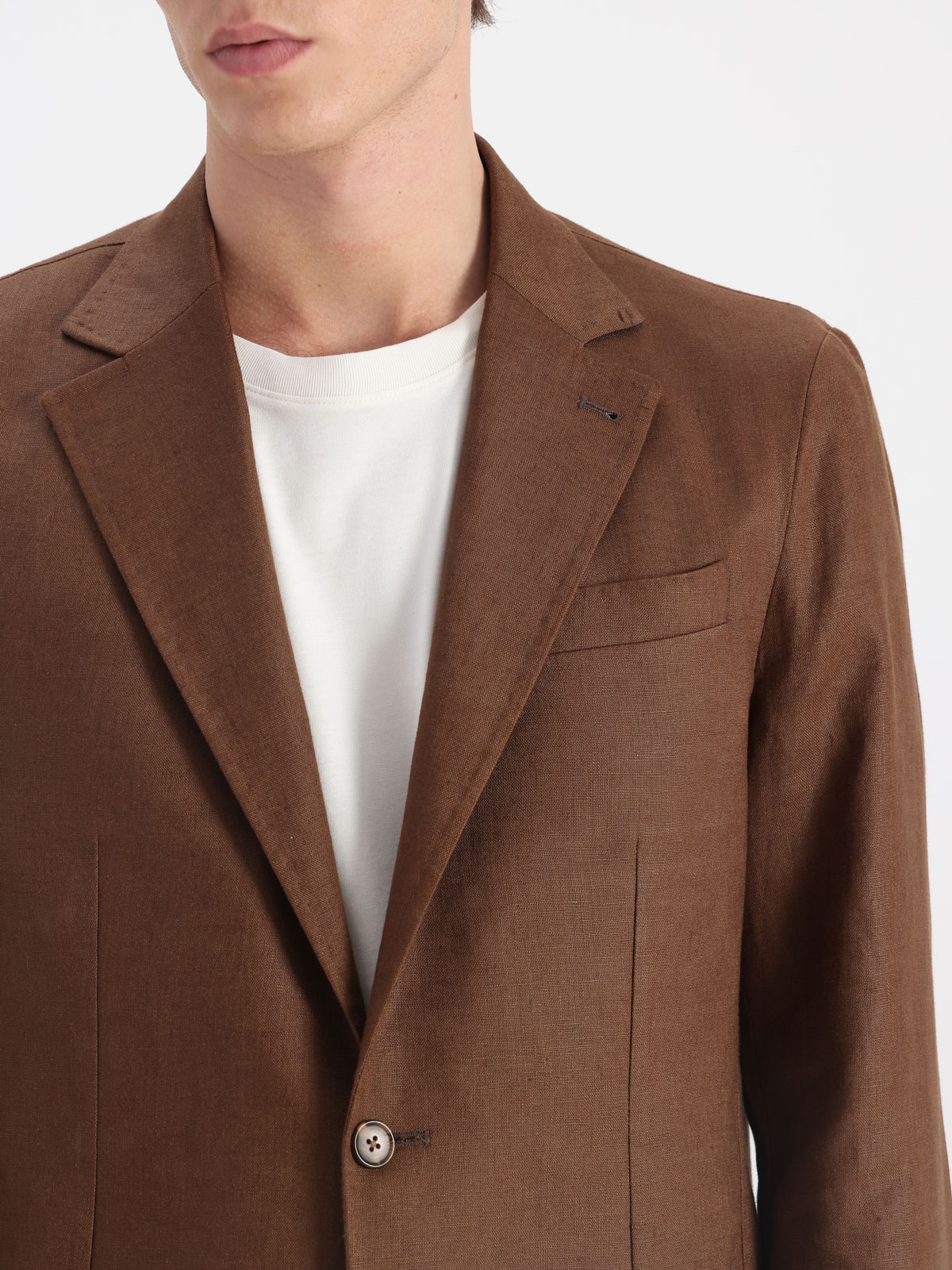 Confeccionado en 100% lino made in italy. Este saco representa elegancia, con un diseño limpio y sofisticado. Su corte clásico, de estructura ligera, resalta la frescura y distinción propias de la tela, ofreciendo un porte impecable en toda ocasión.
