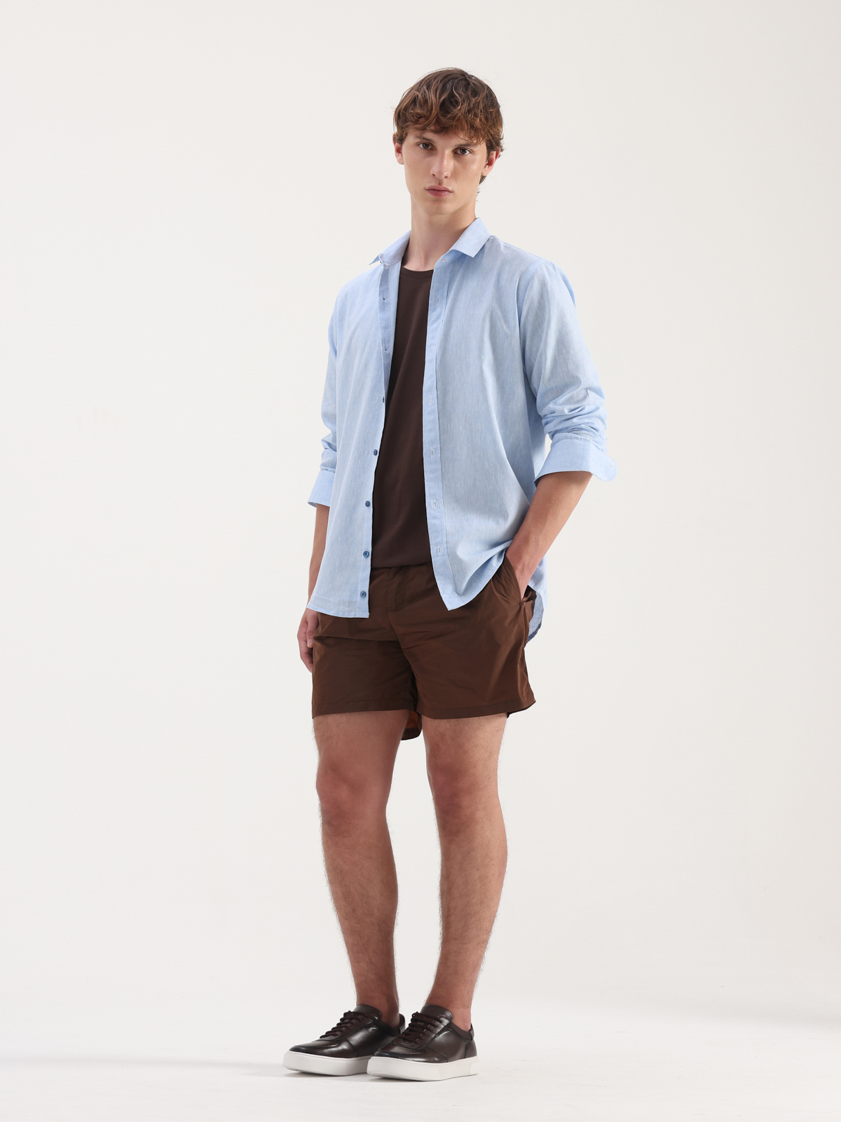 Con una mirada moderna y un estilo versátil, este short de baño equilibra tendencia, confort y ligereza. Se destaca por su cintura elastizada, su práctico cierre frontal y su textil de secado rápido.